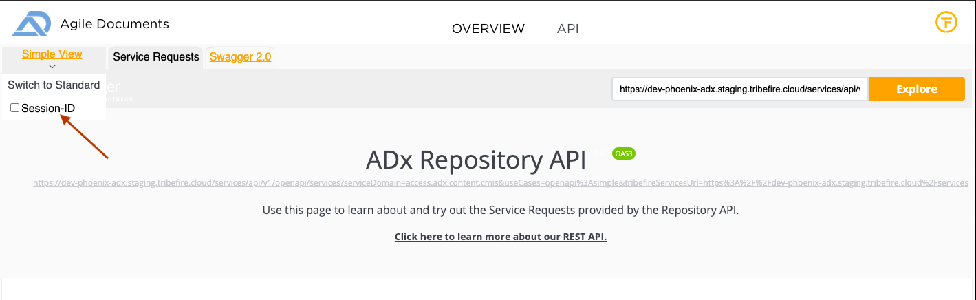 To do that, go to your repository's API page, click the arrow under the Simple View, and then check the Session-ID box.